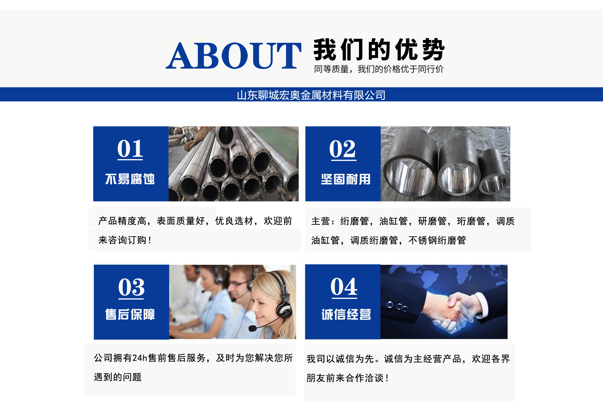 山東聊城宏奧金屬材料有限公司位于風(fēng)景秀麗的江北水城-聊城。地理位置優(yōu)越,交通便利。主營絎磨管,油缸管,研磨管,珩磨管,調(diào)質(zhì)油缸管,調(diào)質(zhì)絎磨管,不銹鋼絎磨管等產(chǎn)品 廣泛應(yīng)用于礦山、起重、船舶、煤炭、運輸、化工、科研、軍工等工業(yè)領(lǐng)域?! 」緫{借雄厚的實力,豐富齊全的規(guī)格品種,完善的質(zhì)量保證,合理的價格,優(yōu)質(zhì)的服務(wù),不斷地受到新老用戶及業(yè)內(nèi)人士的肯定和信任,我們本著及用戶之所及,想用戶之所想的服務(wù)宗旨不斷地拼搏,進(jìn)取,在此對多年來支持我們的各行各業(yè)的新老朋友表示由衷的感謝,愿我們今后的合作更加愉快! 歡迎國內(nèi)外新老客戶來公司視察、蒞臨指導(dǎo)工作!...